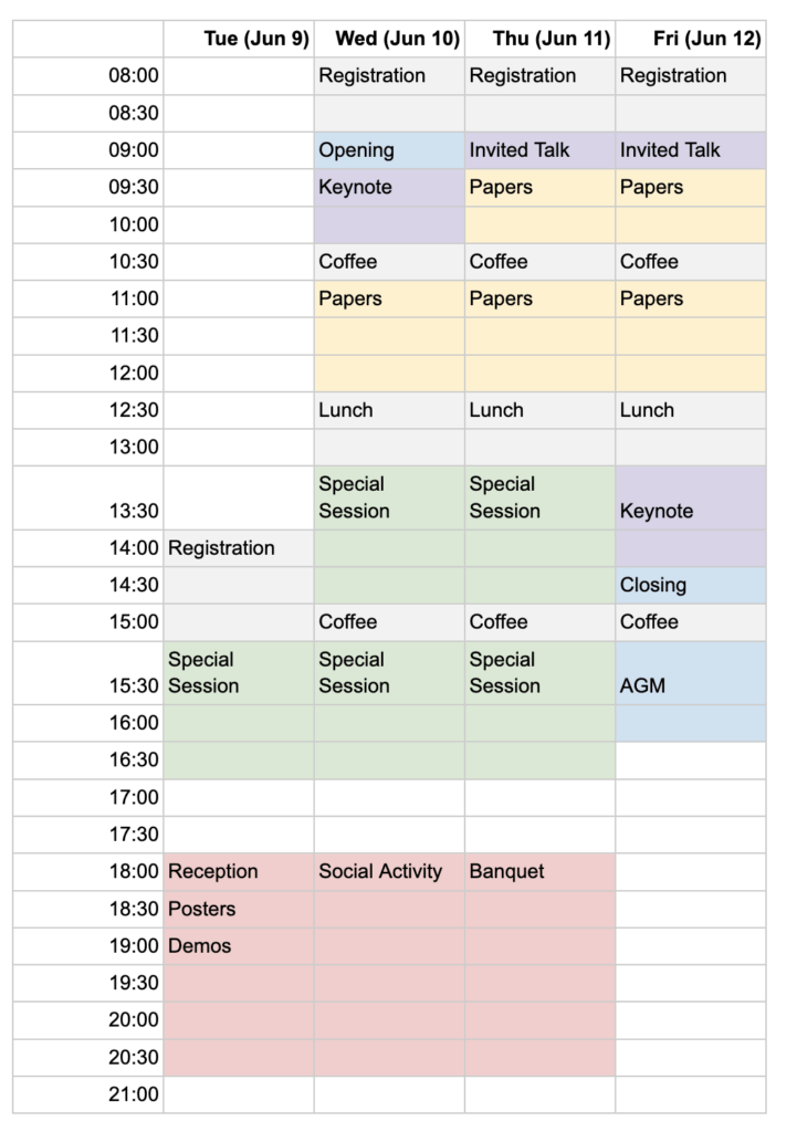 This year, the conference is held over 3.5 days. Registration starts 2pm on Tue June 9 and the final session will end by 4:30pm on Friday June 12. Below is a draft schedule.